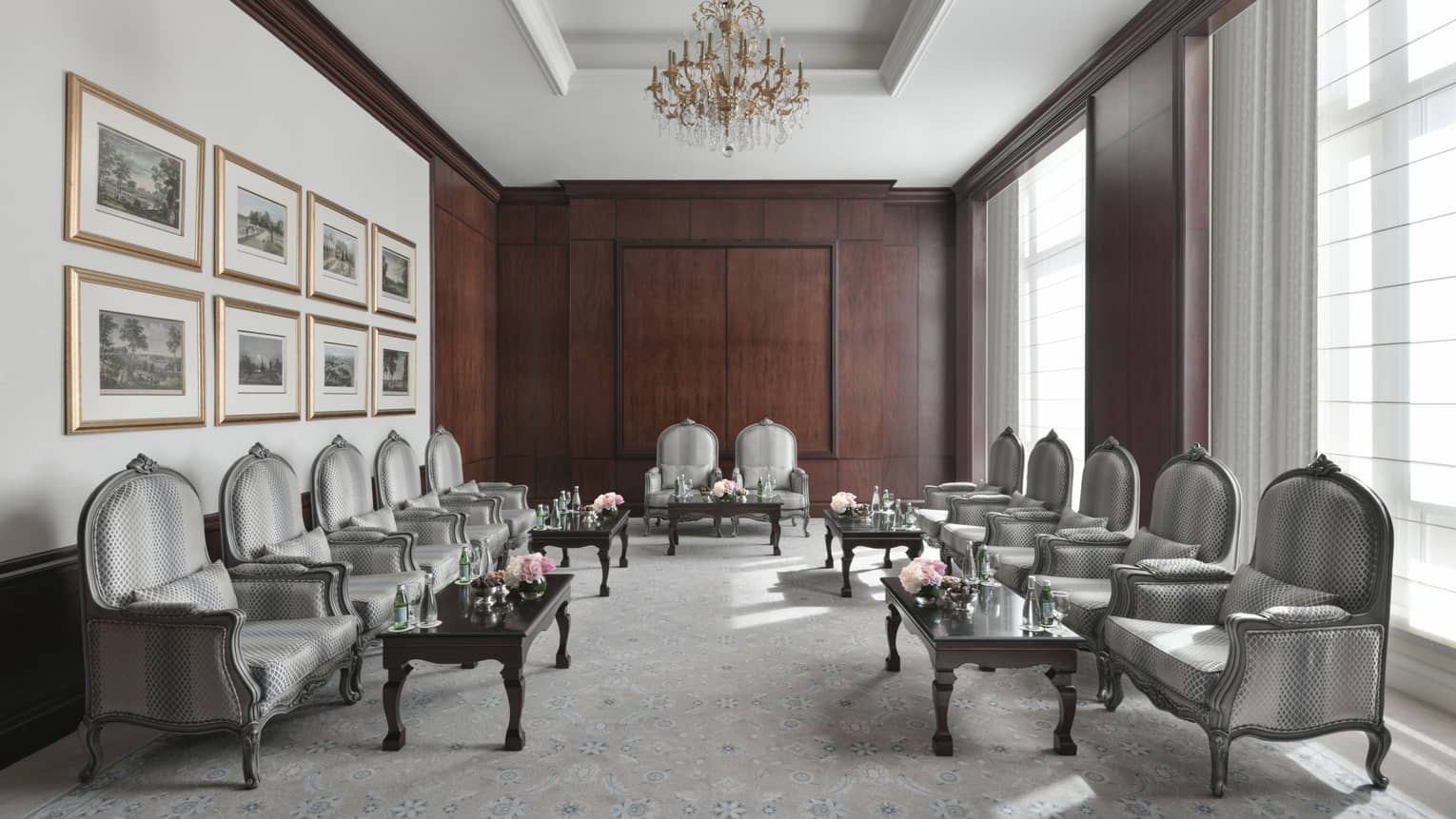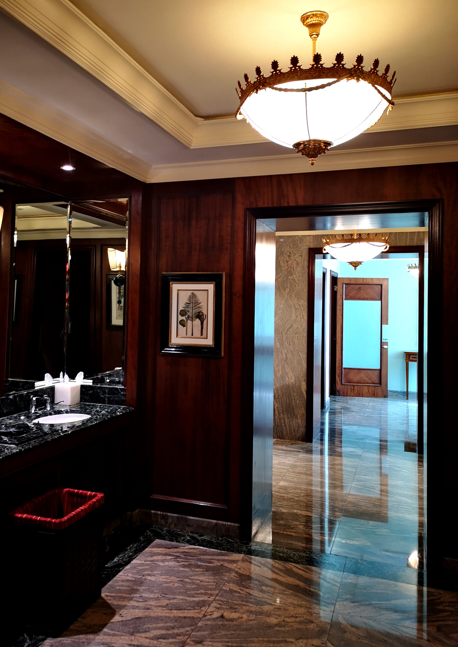 Descending the grand staircases, guests reach the tea lounge overlooking the inner courtyard, visible through large glazed windows. Here, the Empire-style crystal chandelier by G. Moscatelli becomes the focal point of the space.