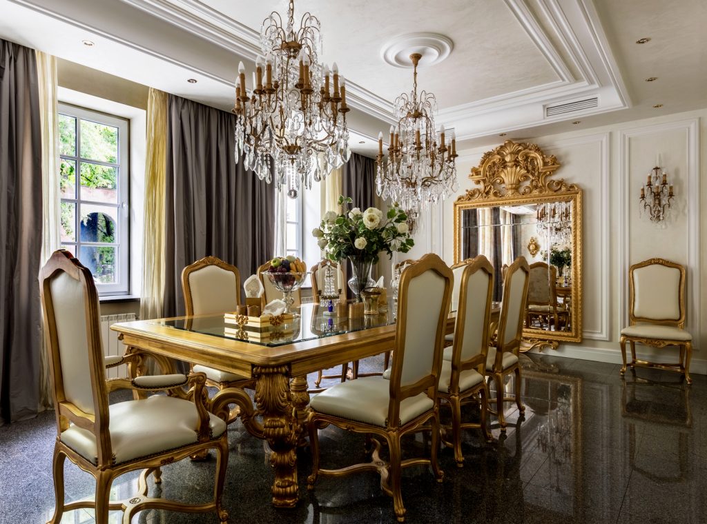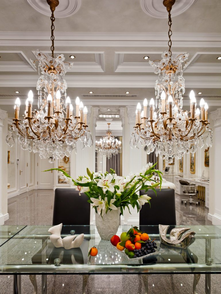 For a private villa project in Russia, we created a chandelier and coordinated wall sconces for a luxurious dining room.