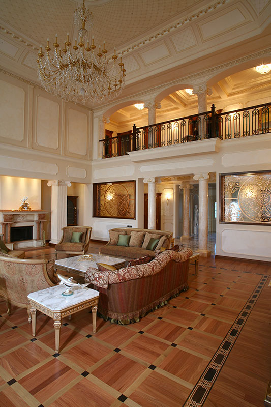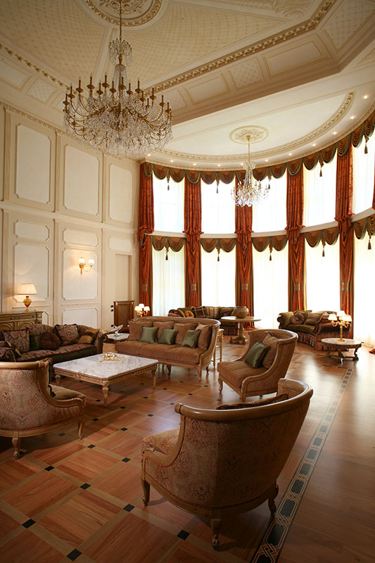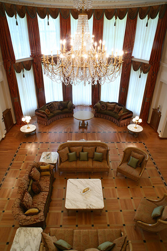 For this private villa in Russia, G. Moscatelli developed a lighting design project conceived to enhance the interiors. The elegant living room is enhanced by cut crystal chandeliers, which become the protagonists of a bright and refined lighting scheme.