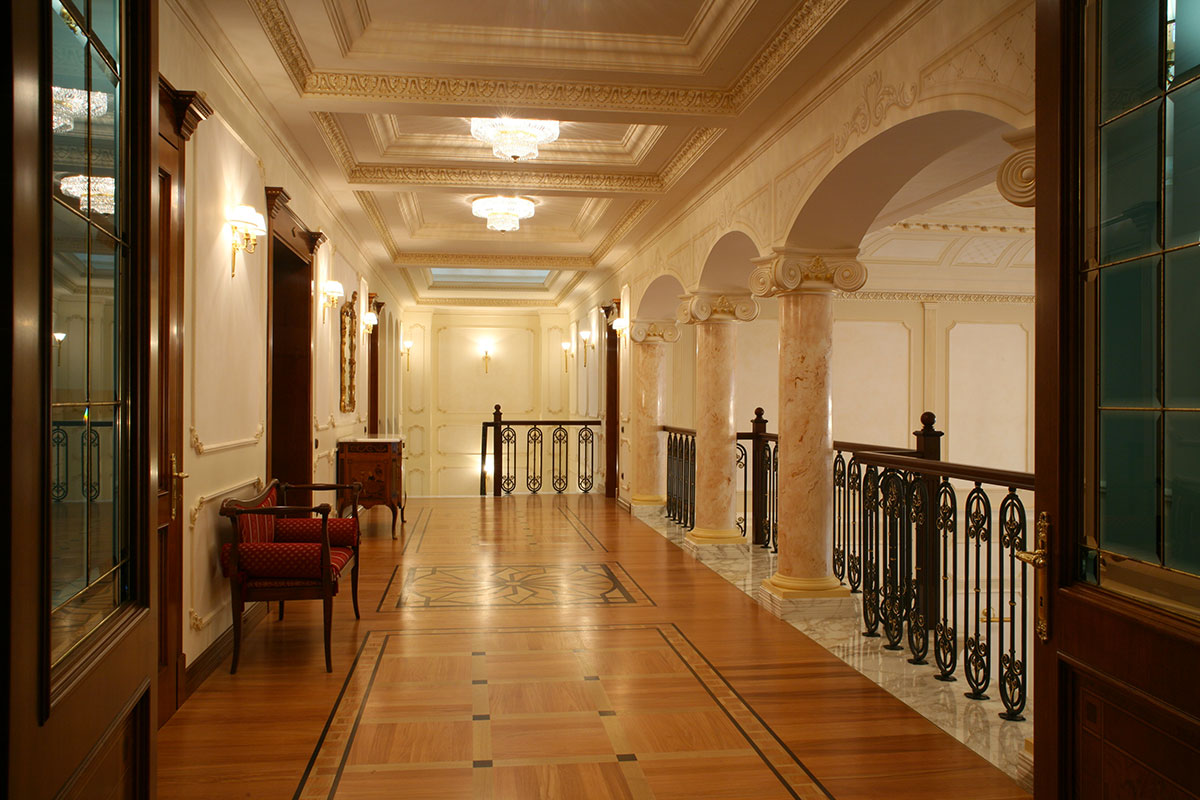 The corridor overlooking the hall is illuminated by crystal ceiling lights, guiding the space with continuity and harmony. In the dining room, an Empire-style crystal chandelier, paired with small crystal ceiling lights, completes the setting with balance and sophistication. A project that interprets luxury through a classical language, using precious materials and carefully studied lighting.