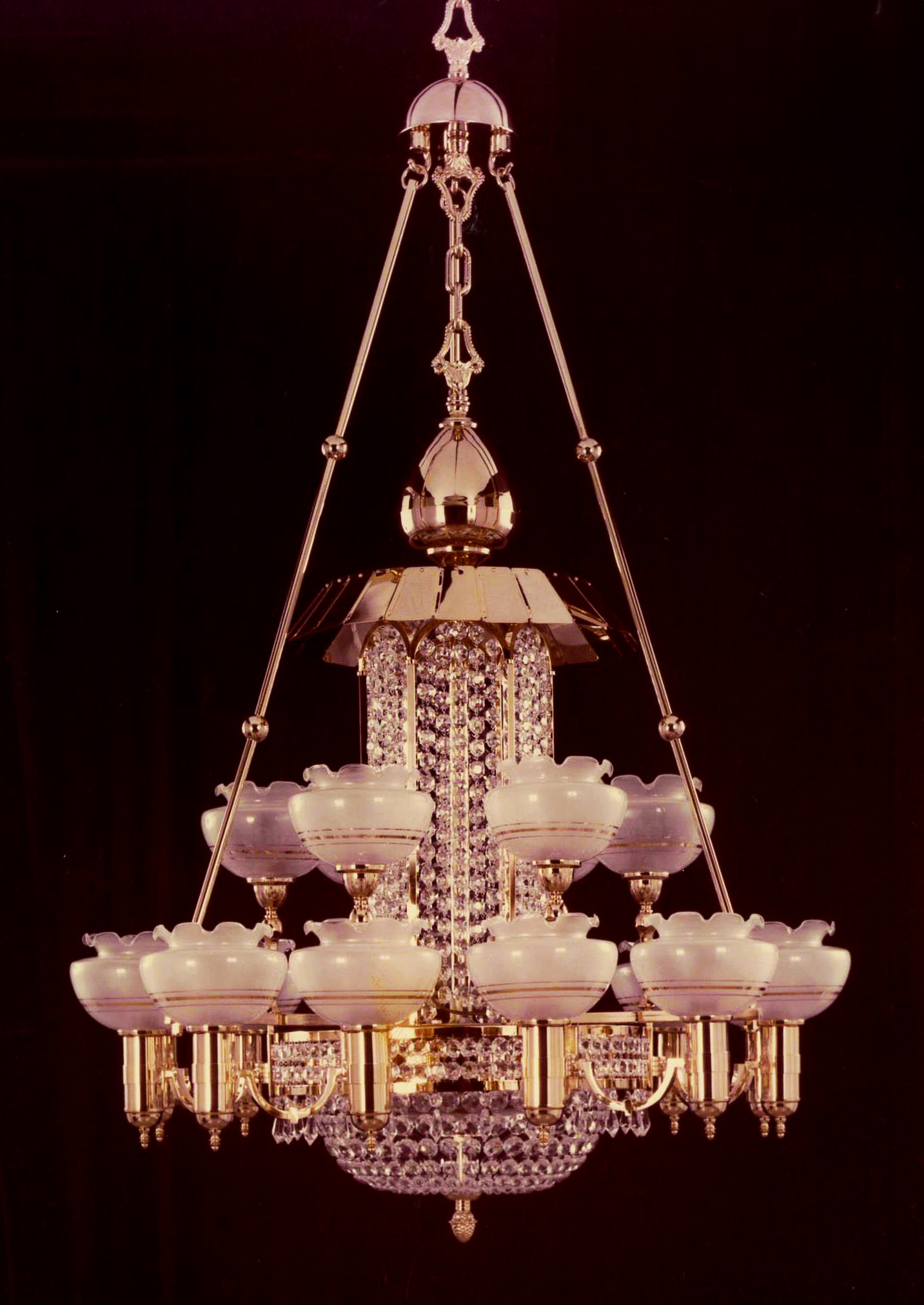The brass structure, chains of cut crystal, and glass cups serving as candle holders bring class and elegance to the space, making light the true protagonist of the environment.