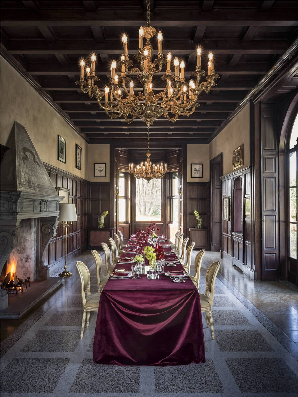 In the dining room overlooking the park, cast brass chandeliers complete the project, providing lighting that is consistent with the setting and reinforcing the residence’s elegant and timeless character.