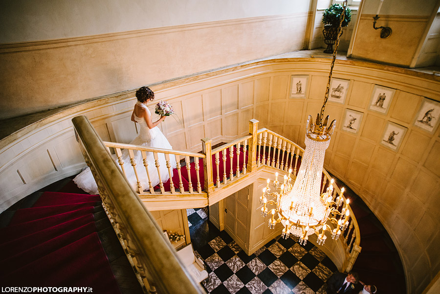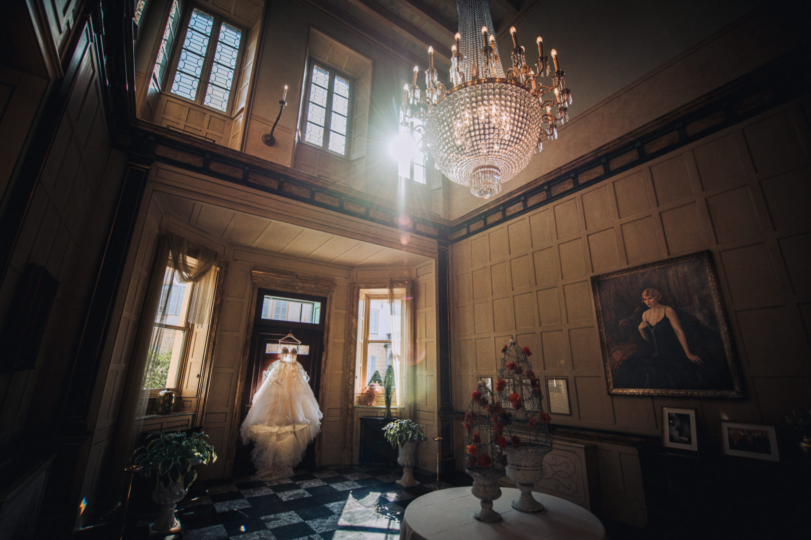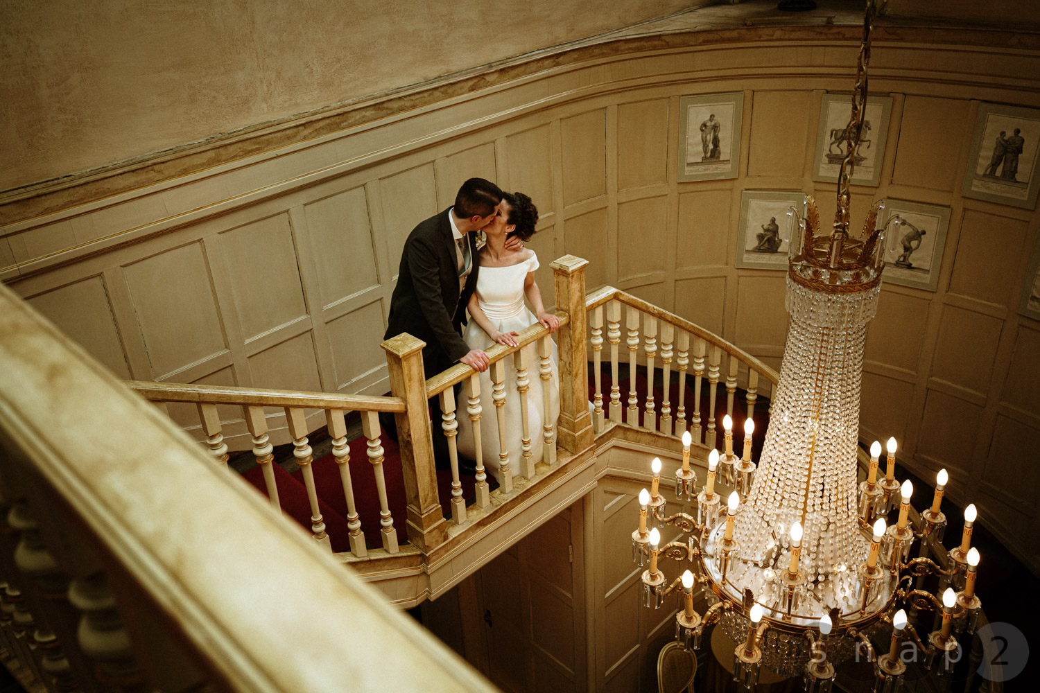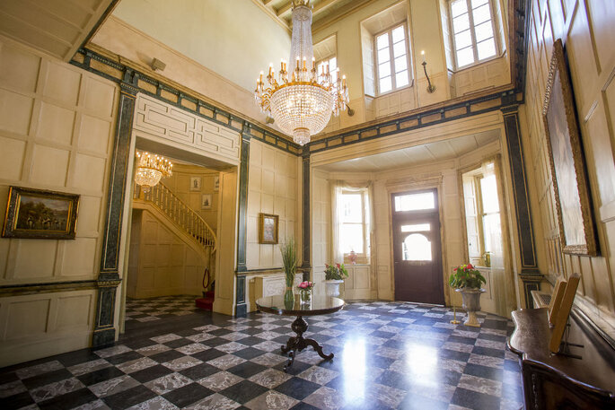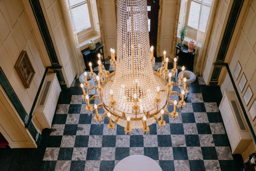 From the main staircase, a crystal chandelier in Empire style descends, featuring a 24K gold finish, guiding the vertical space and becoming a defining element of the interior.