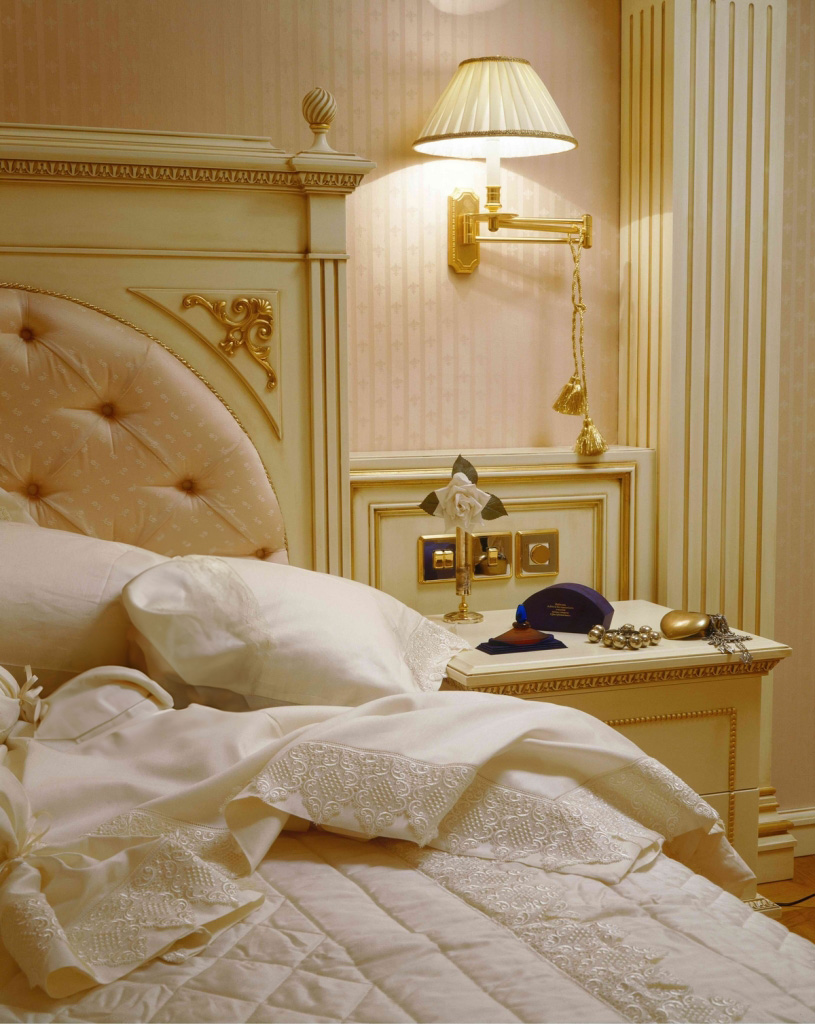 La camera da letto accoglie con applique dotate di braccio regolabile e paralume plissettato in seta, creando un ambiente intimo e confortevole.