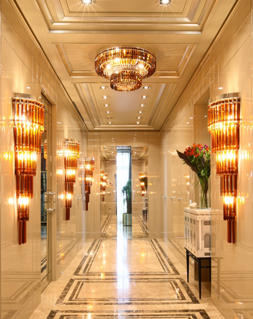 Nel corridoio, applique e un lampadario in cristalli molati color ambra accompagnano il percorso con una luce calda e avvolgente.