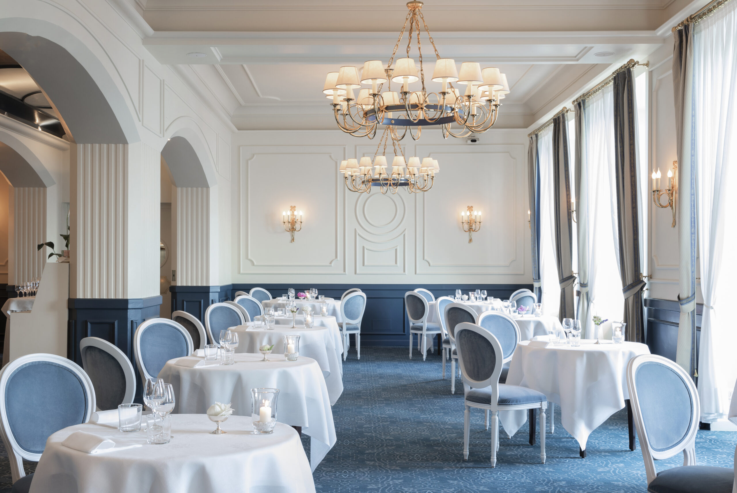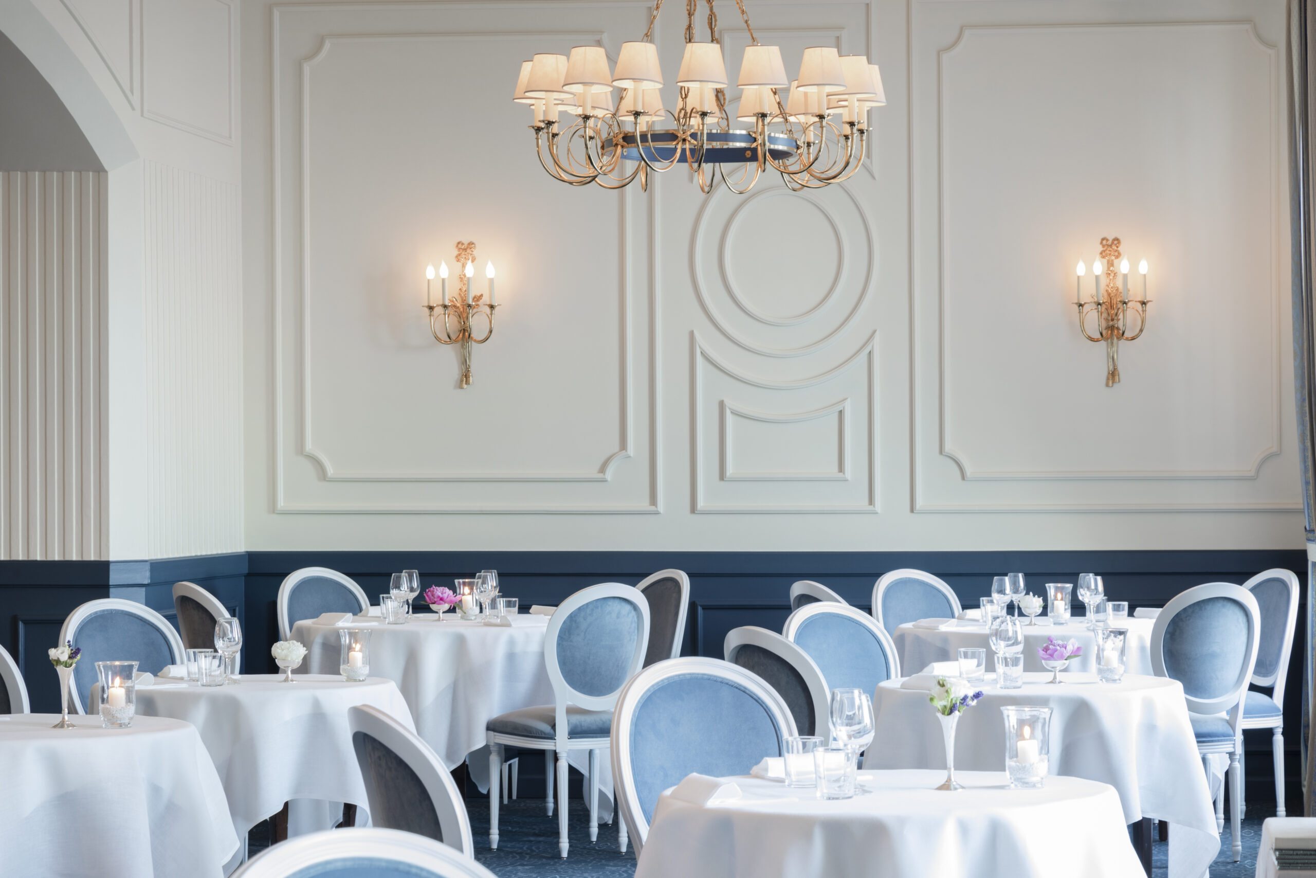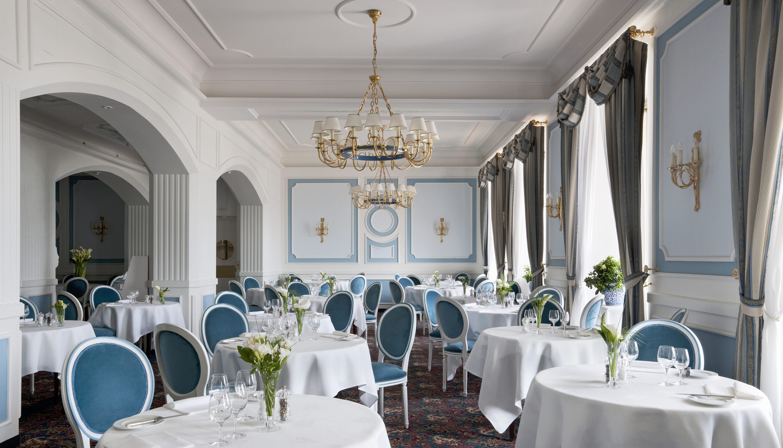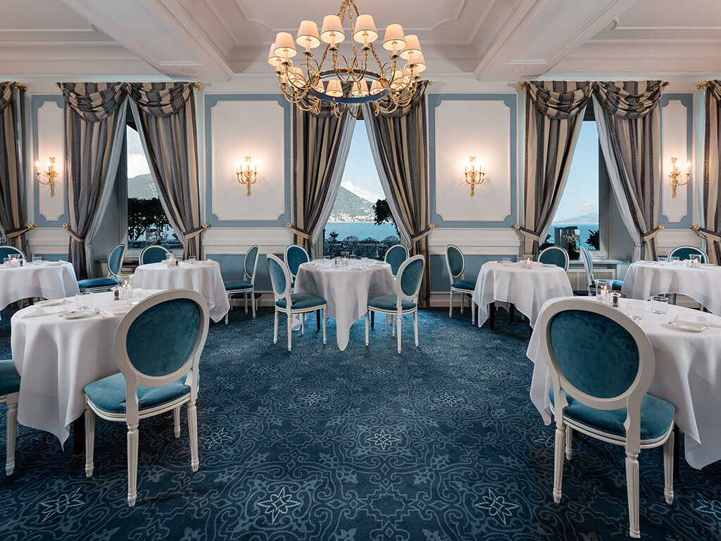 Per l’Hotel Miramare di Santa Margherita Ligure, G. Moscatelli ha realizzato il progetto di illuminazione per la sala da pranzo affacciata sul mare, progettando un lampadario coordinato agli interni e applique con finitura in oro 24K, in continuità con lo stile dell’ambiente.