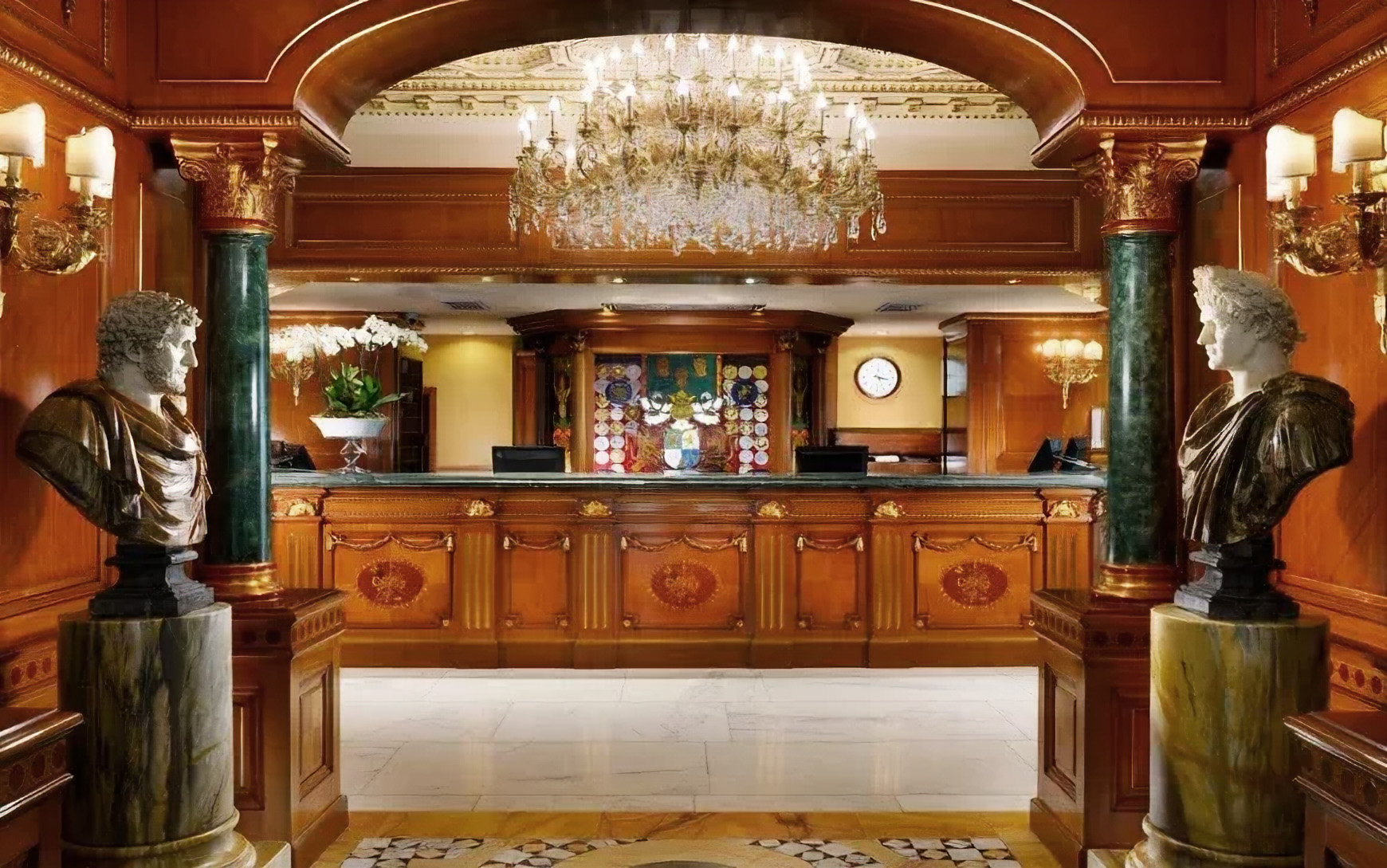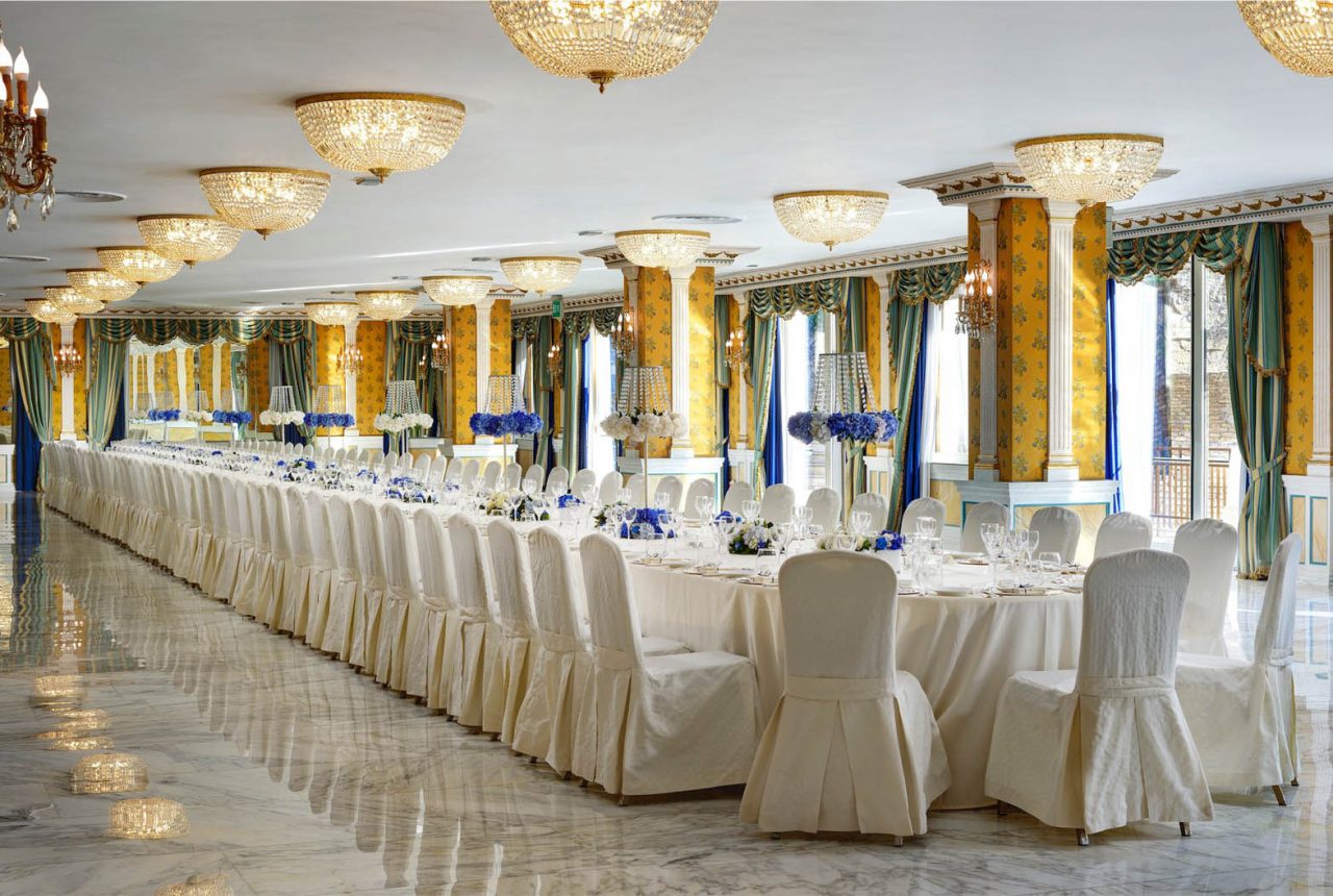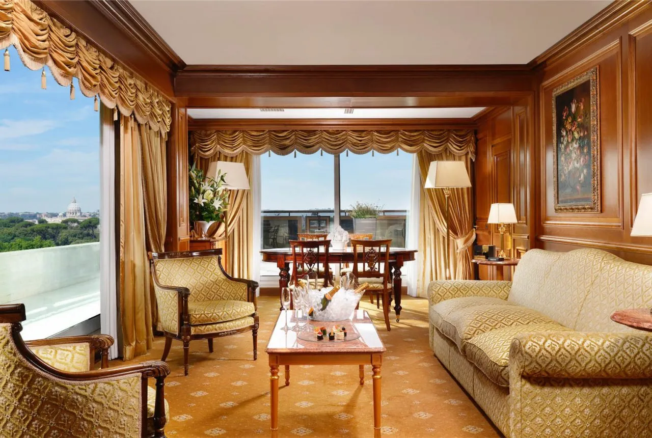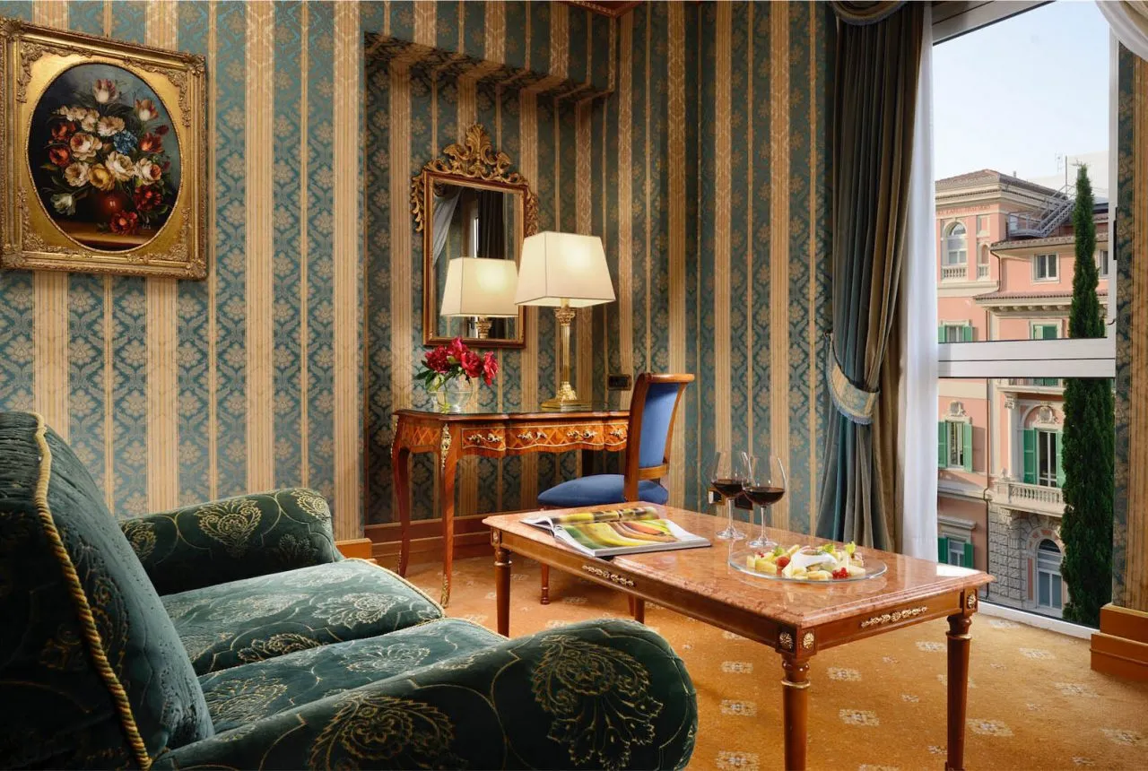 Nelle suite di lusso, una piccola plafoniera in cristallo illumina la piscina interna, mentre lumi da tavola e da terra con paralume in seta completano l’arredo, garantendo comfort e raffinatezza anche negli spazi più intimi.