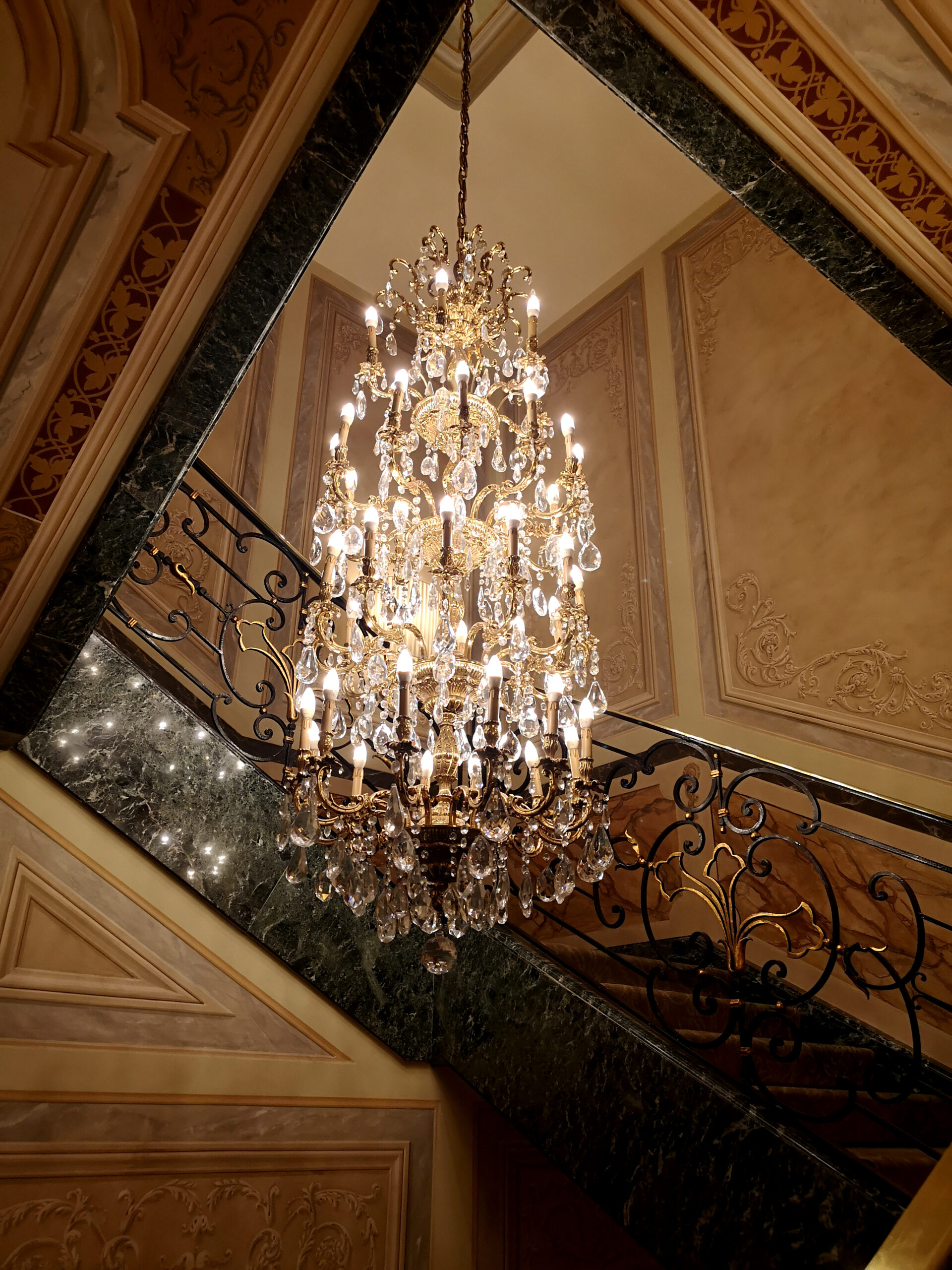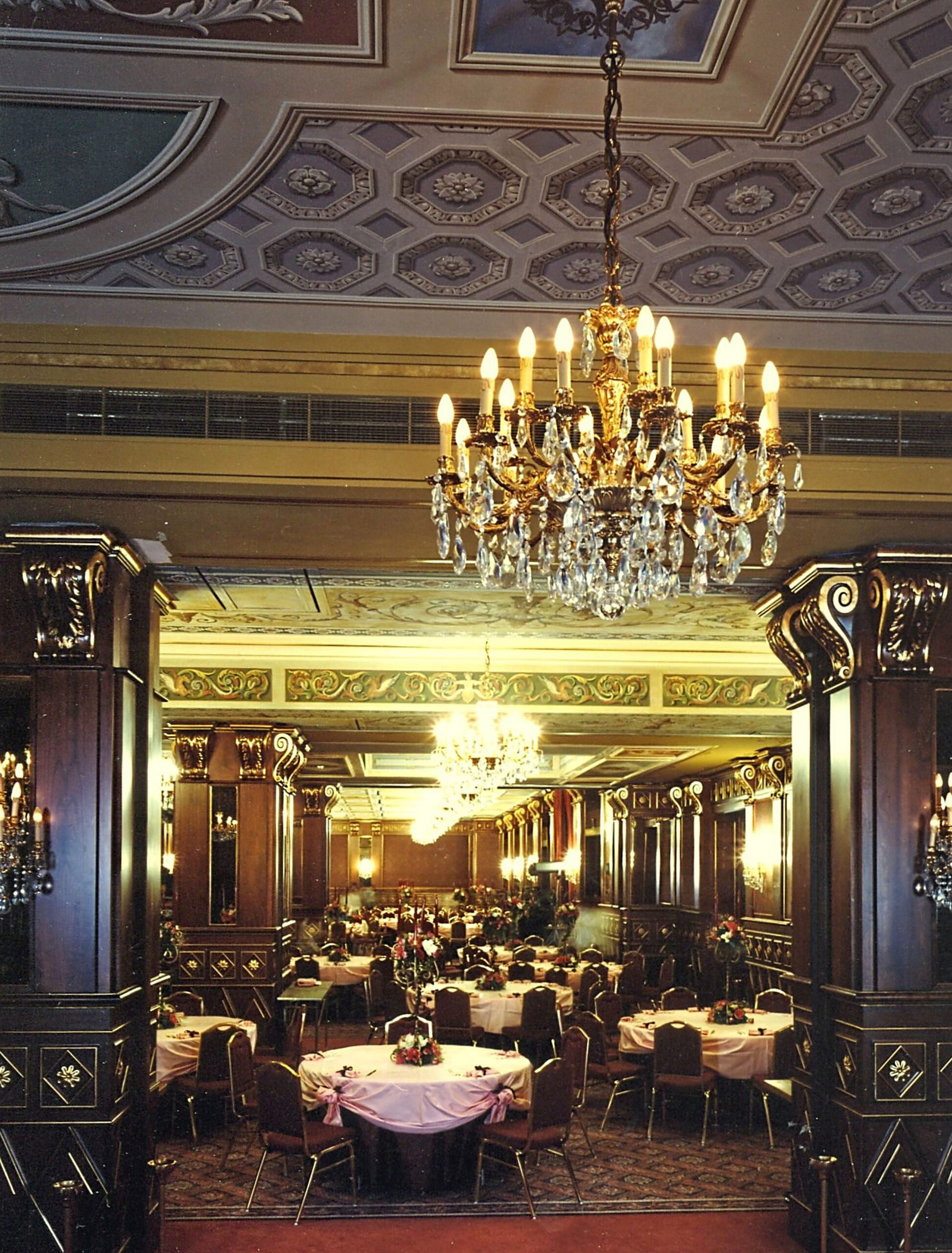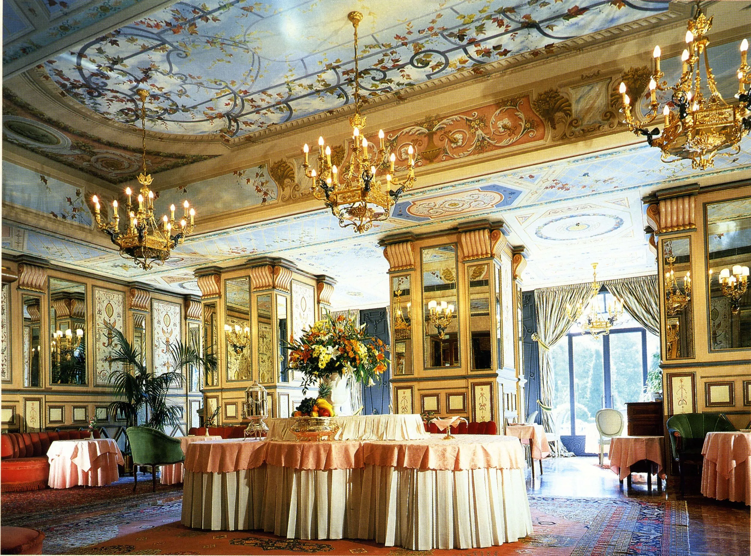 Il progetto originale prevedeva un lampadario in stile Impero che scendeva dalla magnifica cupola decorata, lampadari in cristallo per la sala da pranzo, e lampadari in stile Impero con putti, abbinati a applique coordinate, per la sala colazione.