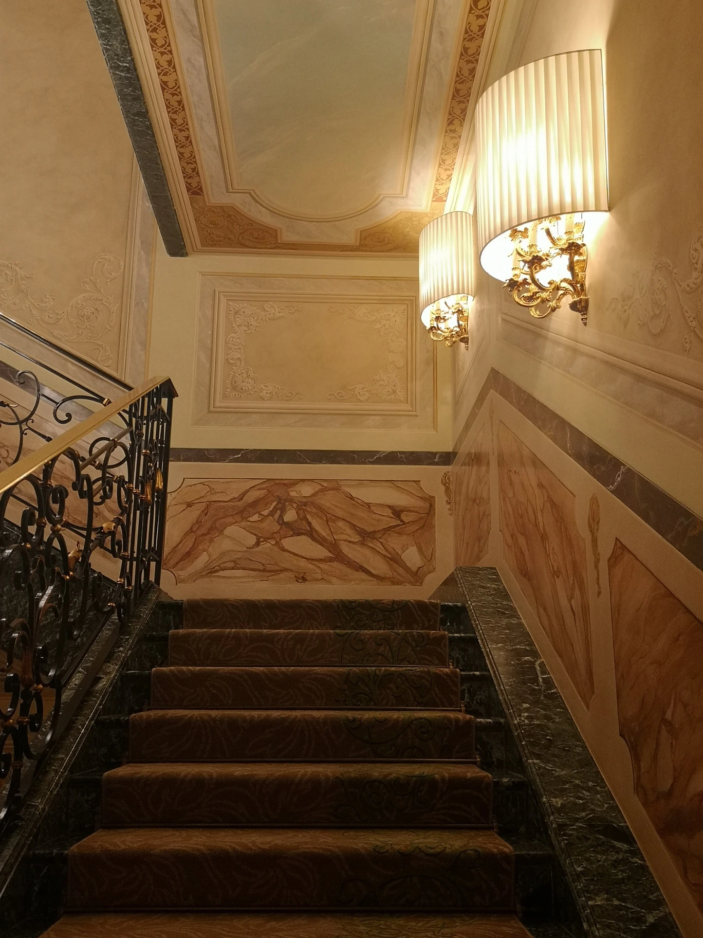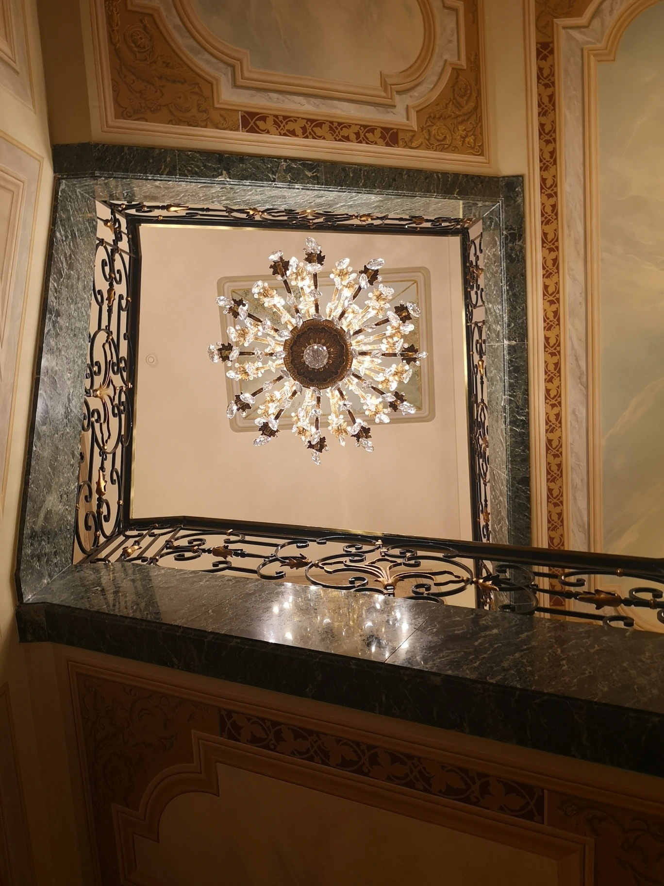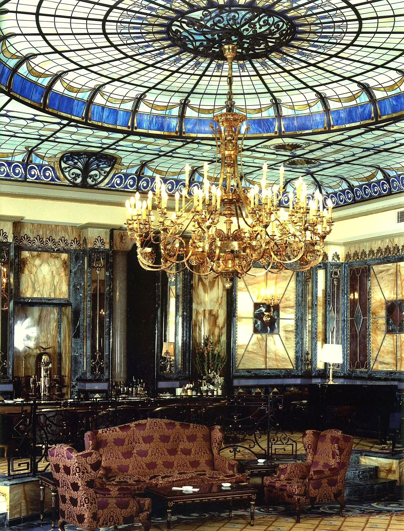Il progetto originale prevedeva un lampadario in stile Impero che scendeva dalla magnifica cupola decorata, lampadari in cristallo per la sala da pranzo, e lampadari in stile Impero con putti, abbinati a applique coordinate, per la sala colazione.