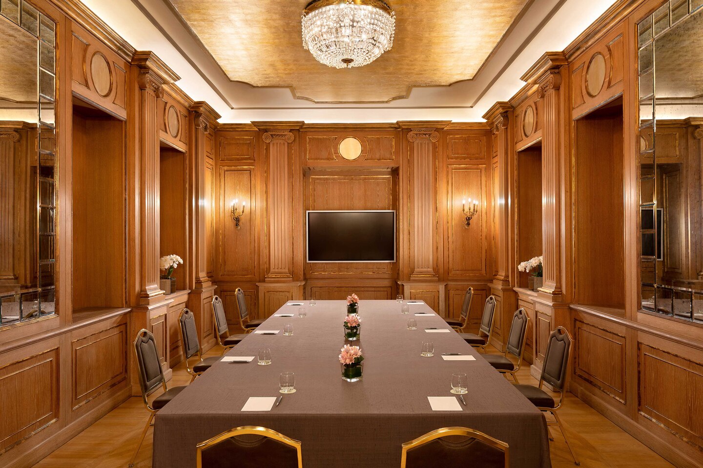 Il percorso prosegue nella hall, dove plafoniere in cristallo garantiscono un’illuminazione equilibrata e armoniosa degli spazi comuni. Nella sala eventi, i lampadari in cristallo firmati G. Moscatelli definiscono l’ambiente con eleganza e misura. Il progetto si estende anche alla sala conferenze, illuminata da lampadari in cristallo in stile Impero, assicurando continuità visiva e coerenza in tutte le aree di rappresentanza dell’hotel.